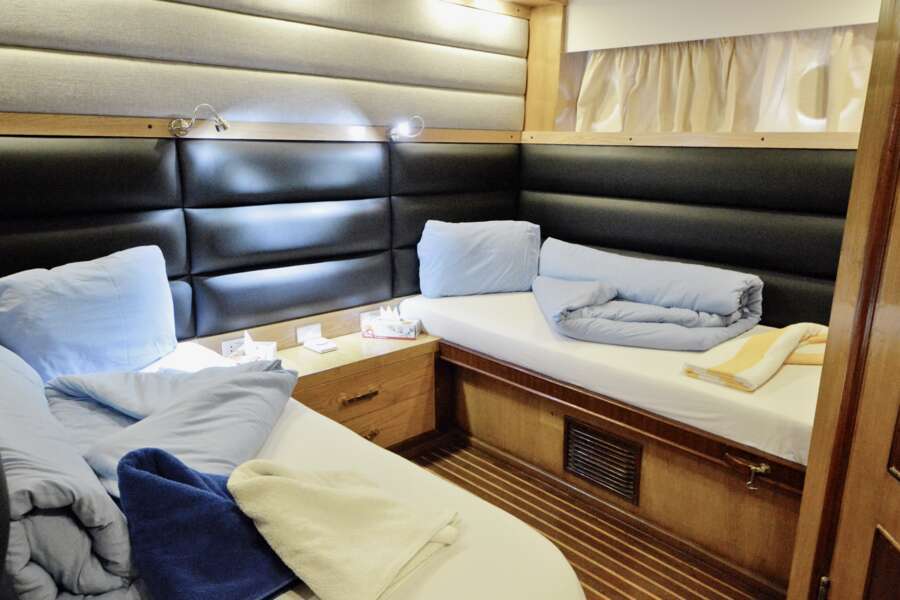 8 Zweibettkabinen im Unterdeck und 2 Masterkabinen mit Doppelbett im Oberdeck. Alle Kabinen mit Bad/WC, Dusche, Handtüchern, Klimaanlage.