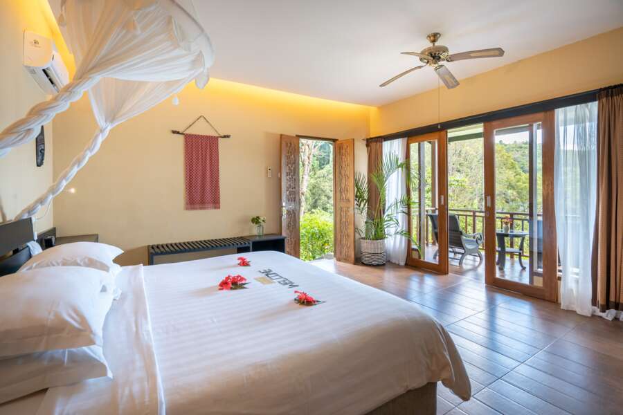 Das Resort verfügt über 20 Unterkünfte, die mit Klimaanlage, Badezimmer mit Dusche/WC, Veranda mit Sitzgelegenheiten, Minibar, einen Wasserspender, Safe und Kingsize-Bett ausgestattet sind.
