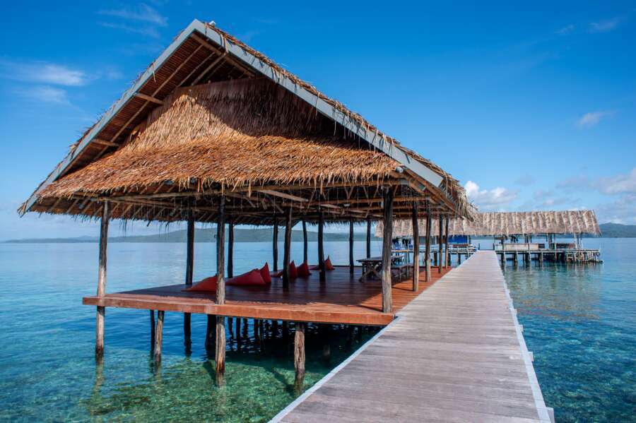 Landestypische Hütten wurden in traditioneller Weise über dem Meer erbaut. So liegen auch das offene Restaurant und die Küche auf Stelzen über dem Strand. An Land befinden sich die Sanitäranlagen für die Papuan- und Superior Water Cottages, bestehend aus 6 Gemeinschaftsbädern mit westlichen Duschen und Toiletten. Ansonsten finden sich an Land nur Lagerräume, Kompressoren und die Wasseraufbereitungsanlage. Wi-Fi steht im Hauptbereich des Resorts zur Verfügung.
