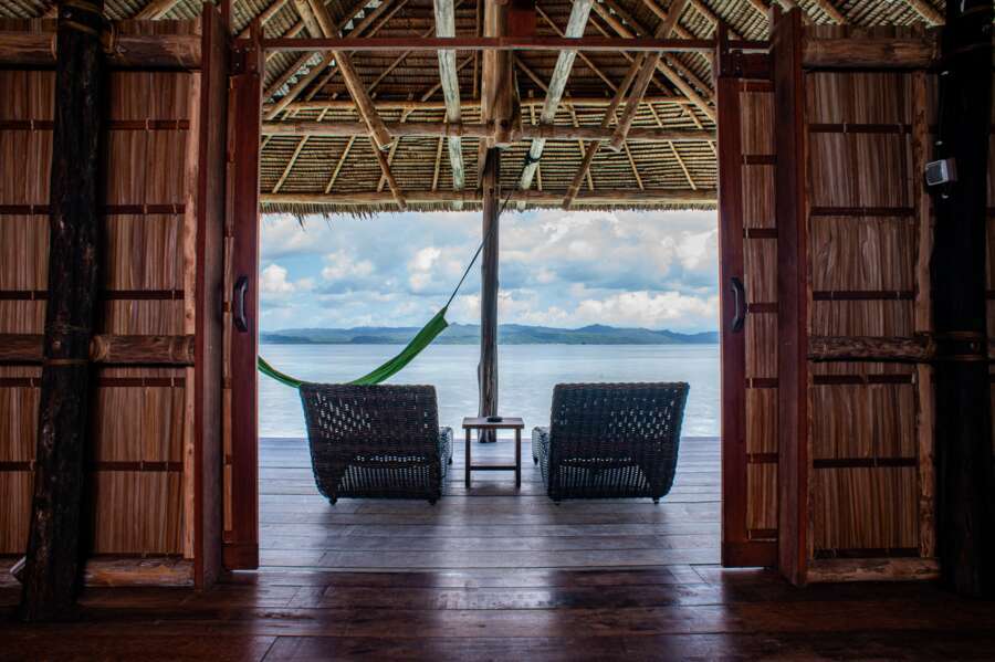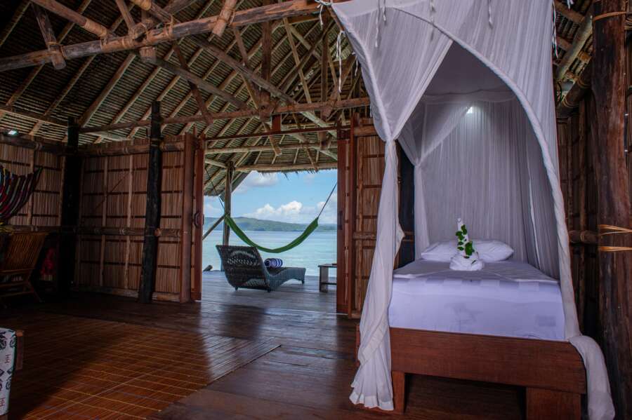 Die 2 Papuan Water Cottages liegen am Hauptjetty und verfügen über ein Doppelbett oder zwei Einzelbetten, sowie eine kleine Veranda mit Hängematte und Sitzmöglichkeiten.