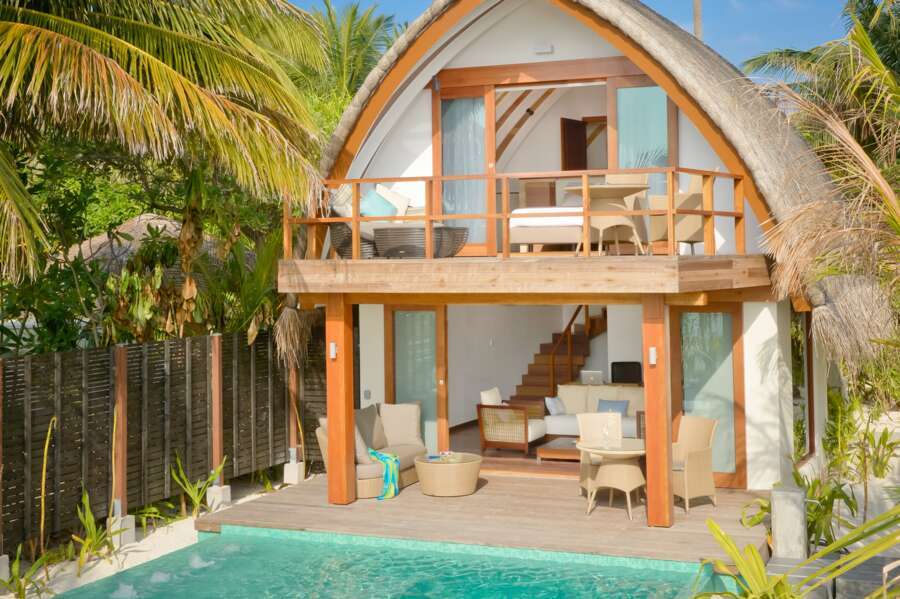 Die 30 Unterkünfte sind im maledivischen Stil gebaut und mit moderner Infrastruktur eingerichtet. Alle Zimmer verfügen über Klimaanlage, Ventilator, TV, iPad, Telefon, Minibar, Espresso-Maschine, Wasserkocher, Weinklimaschrank, Safe, Haartrockner, maledivisches oder geschlossenes Bad mit Dusche. Die 6 Beach Villas (85 m²) liegen auf der Westseite der Insel und bieten ein großzügiges Open-Air-Badezimmer mit Whirlpool-Badewanne und Außendusche sowie Tagesbett auf der Veranda.