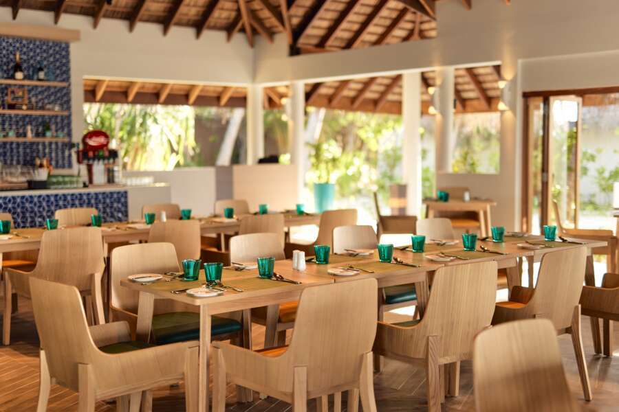Im Hauptrestaurant «Soul Kitchen» werden Speisen aus aller Welt im Buffetstil serviert, das «Flames» überzeugt abends mit feinsten Grillspezialitäten und das Überwasser-Restaurant «Mizu» bietet an seinen Live-Cooking-Stationen erstklassige Teppanyaki-Menues an. Neben der Hauptbar «Wink», in der tagsüber auch Pizza und Snacks angeboten werden, lädt die Poolbar «Solis» zu kreativen Cocktails und frischen Fruchtsäften in entspanntem Ambiente ein. Zudem verfügt das Resort über einen Swimmingpool, Eskape Spa über Wasser mit 4 Behandlungsräumen, Boutique, kostenloses Wi-Fi auf der ganzen Insel, diverse Ausflüge, medizinisches Fachpersonal auf der Insel, täglich abends Live-Musik und Abendunterhaltung.