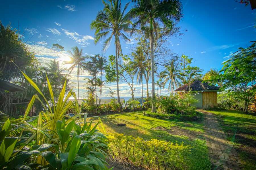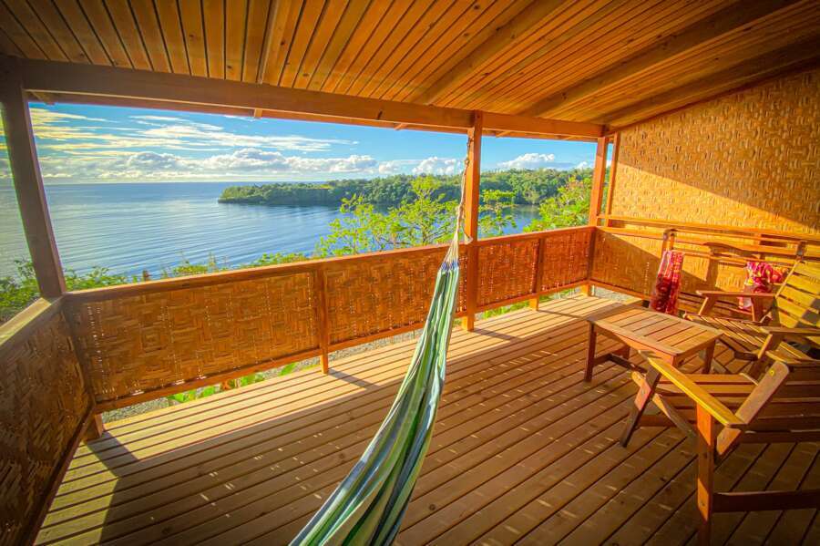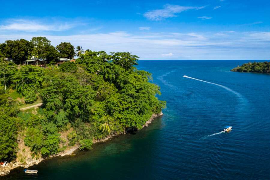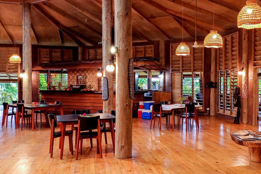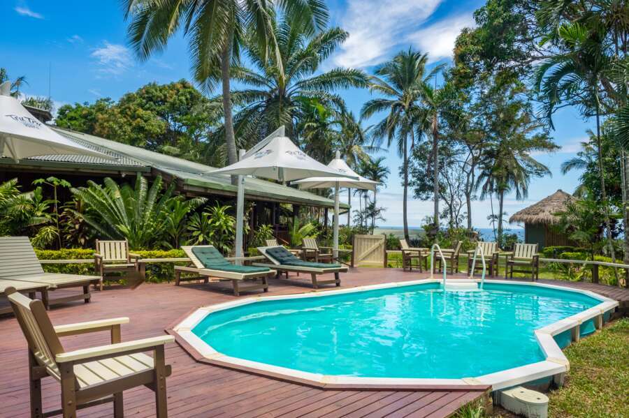 Auf der Hauptinsel, 250 Kilometer östlich von Port Moresby. Das Resort steht erhöht auf einer Klippe.